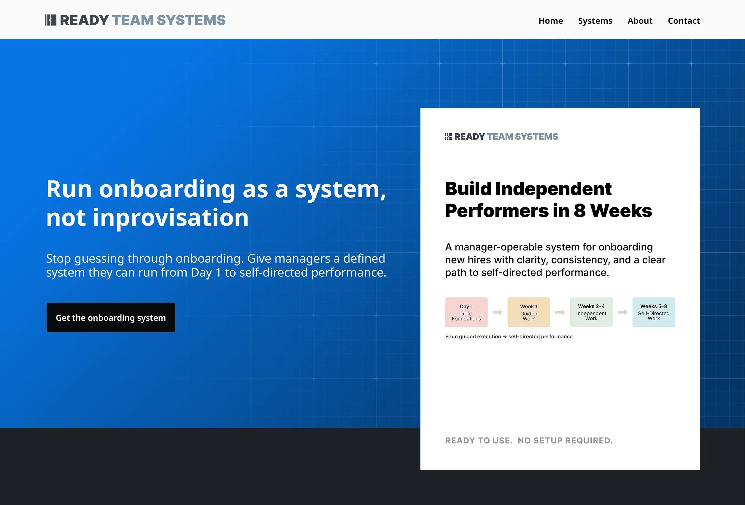 readyteamsystems.com is my own venture, and the site is one part of a larger system I designed, built, and tuned from the ground up.